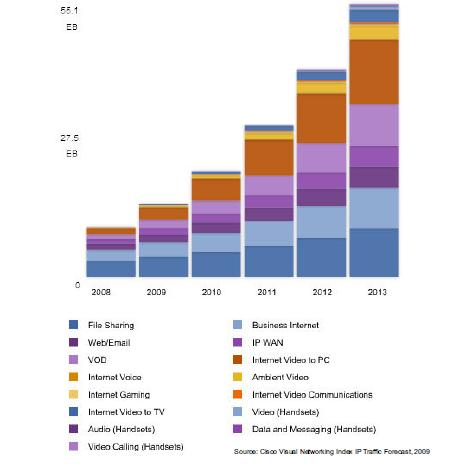 如圖1所示,從2007年到2012年,IP總流量將增加6倍,幾乎每兩年就翻倍。2012年之前,流量每年增長522exabytes(1018,即zettabyte的一半)。這種指數(shù)增長的主要推動力量是高清晰視頻和高速寬帶消費類應用。
