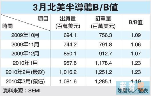 晶圓代工法說會下周報到,SEMI最新公布3月北美半導體B/B值1.19,代表半導體設備業者三個月平均出貨100美元,接獲119美元的訂單,顯示半導體業者添購機器的意愿仍強,半導體景氣正面以對。