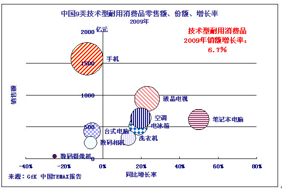 2009年,中國技術(shù)型耐用消費(fèi)品零售總額8442億元(按1美元=6.82元人民幣計算,為1238億美元),比2008年增長6.7%。這一數(shù)字略低于2008年的同比增長率7.7%,但是,考慮到中國經(jīng)濟(jì)經(jīng)歷了2008年末開始的經(jīng)濟(jì)危機(jī)、2009年上半年的前景不確定性等不利因素,2009年中國技術(shù)型耐用消費(fèi)品市場還是交出了一份令人比較滿意的答卷。