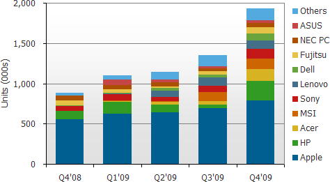 由于Apple iMac并不提供觸控功能,觸控產(chǎn)品的滲透率未能大幅提升,以2009年第四季為例,含觸控功能AIO PC市占率為22.4%;以不考慮Apple產(chǎn)品在內(nèi),含觸控功能AIO PCs市占率為37.7%。按區(qū)域別來看(不包括Apple系列),2009年北美與EMEA為前二大市場(chǎng),市占率分別是25%及27%,中國(guó)大陸與日本分別以19%與17%居第三及第四名。不過包含觸控功能AIO PCs以北美為主,北美市占率達(dá)到24%,中國(guó)大陸僅有2%。不論是包不包括觸控功能,AIO PCs在未來幾年市場(chǎng)都是相當(dāng)樂觀的。品牌廠商除了可以有相當(dāng)廣產(chǎn)品線及采用不同價(jià)格以吸引不同消費(fèi)者,同時(shí)產(chǎn)品外觀設(shè)計(jì)也愈來愈吸引人。我們以為除了上網(wǎng)本與平板計(jì)算機(jī)外,AIO PCs將是下一個(gè)市場(chǎng)明星。
