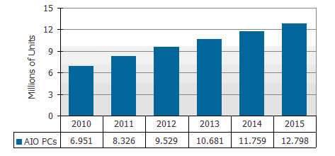 圖二:2010-2015年AIO PCs出貨量預(yù)測(cè)(單位:百萬臺(tái))