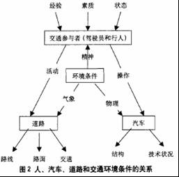 汽車道路交通事故是世界性的災(zāi)害,因此汽車交通安全也是世界性的難題。道路交通事故引起人的傷亡,財(cái)產(chǎn)的損失,給國(guó)民經(jīng)濟(jì)也帶來(lái)了巨大的損失。然而誘發(fā)交通事故的因素是多方面的,它受汽車行車速度、道路條件、車輛狀況、駕駛員行為、駕駛員的文化素質(zhì)和自然環(huán)境等因素的綜合影響。其中人、汽車、道路、環(huán)境條件是影響道路交通安全的主要因素,它們之間的關(guān)系見圖2。