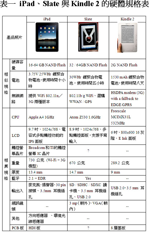 平板電腦iPad、Slate以及電子書閱讀器Kindle 2的硬體規格表如表一所示,從此表的硬體規格資料中,我們可以得知,iPad、Slate和Kindle 2采用的硬體規格有其相似處,也有其相異之處。