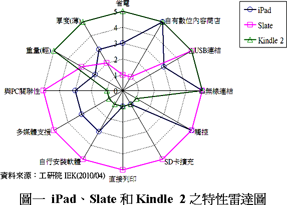 工研院IEK進行iPad、Slate和Kindle 2三種產品有關省電、自有數位內容商店、USB連結、無線連結、觸控、SD卡擴充、直接列印、自行安裝軟體、多媒體支援、與PC關聯性、重量(輕)和厚度(薄)等特性的競比,1分代表不具有其特性,為最低比重,分數越高代表與此特性關聯性越強,完全相關聯為最高5分,將其結果繪制成雷達圖(圖一)表示。