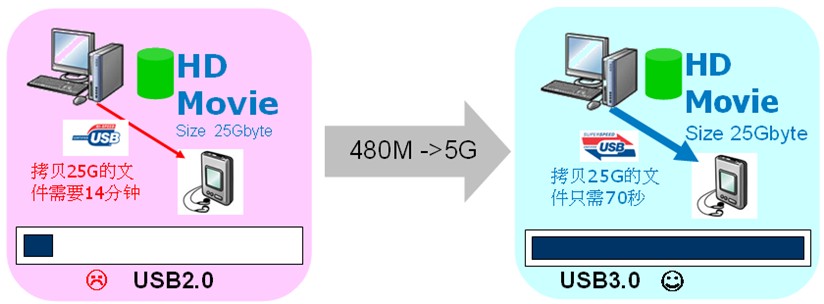 盡管USB2.0的速度已經(jīng)相當(dāng)快,對(duì)于目前高清視頻和TB級(jí)別的數(shù)據(jù)傳輸還是有些慢,在2008年11月,HP、Intel、微軟、NEC、ST-NXP、TI聯(lián)合起來正式發(fā)布了USB3.0的V1.0規(guī)范。USB3.0又稱為Super Speed USB,比特率高達(dá)5Gbps,相比目前USB2.0的480Mbps的速率,提高了10倍以上,引用Intel專家Jeff Ravencraft的話:“以25GB的文件傳輸為例,USB2.0需要14分鐘,而3.0只需70秒左右(如圖1所示)。”25GB,正好是單面單層藍(lán)光光盤的容量。USB3.0預(yù)計(jì)將在2011年逐漸在計(jì)算機(jī)和消費(fèi)電子產(chǎn)品上使用。