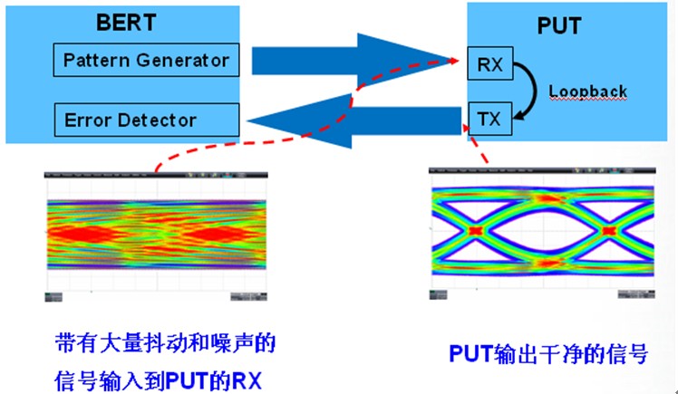 圖3為接收機(jī)測(cè)試的示意圖。接收機(jī)測(cè)試所需的儀器是誤碼率測(cè)試儀(簡(jiǎn)稱BERT),BERT通常包括碼型發(fā)生器(Pattern Generator)和誤碼檢測(cè)器(Error Detector)兩部分。在接收機(jī)測(cè)試時(shí),碼型發(fā)生器輸出特定碼型的、帶有大量抖動(dòng)和噪聲的信號(hào)到待測(cè)試產(chǎn)品(Product Under Test,簡(jiǎn)稱PUT)的RX,PUT接收到后通過時(shí)鐘與數(shù)據(jù)恢復(fù)電路(簡(jiǎn)稱CDR)、判別電路和解碼得到1和0組合的比特流,然后環(huán)回到輸出寄存器,從PUT的TX緩沖器發(fā)送出去,PUT的TX連接到了BERT的誤碼檢測(cè)器,誤碼檢測(cè)器中的CDR、判別電路處理后解碼得到1與0組合的數(shù)據(jù)比特流,然后與碼型發(fā)生器輸出的特定碼型數(shù)據(jù)對(duì)比,如果兩者完全吻合則沒有誤碼,否則,記錄下誤碼的數(shù)量和接收到的碼流的比特總數(shù),前者除以后者即誤碼率,同時(shí)記錄接收到誤碼時(shí)碼型發(fā)生器輸出信號(hào)的抖動(dòng)值。如果用示波器測(cè)量PUT的RX端接收到的信號(hào)的眼圖,通常是閉合的,如圖3的左下圖所示;如果用示波器測(cè)量PUT的TX端輸出信號(hào)的眼圖,通常是良好的眼圖,如圖3右下圖所示。修改碼型發(fā)生器輸出信號(hào)的隨機(jī)抖動(dòng)、固有抖動(dòng)、信號(hào)幅度等參數(shù),可以快速評(píng)估PUT的接收機(jī)性能。