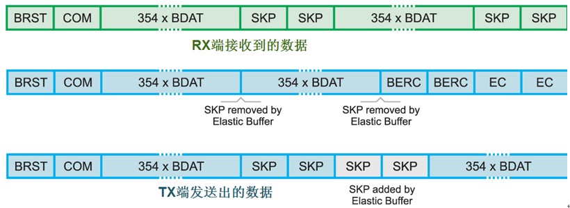 在USB3.0中,鏈路兩端的產(chǎn)品的參考時(shí)鐘頻率可能是不一樣的,參考時(shí)鐘允許的精度為+/-300ppm,SSC展頻引入的頻率偏差為0到-5000ppm,所以總的頻率偏差在-5300ppm到300ppm。為了補(bǔ)償頻率偏差,在USB3中的數(shù)據(jù)流中每354個(gè)symbol要插入兩個(gè)SKP(即K28.1碼),接收端需要能識(shí)別和刪除SKP,在USB3.0芯片中,添加和刪除SKP是由Elasticity Buffer來實(shí)現(xiàn)的(詳見USB3.0 Specification的6.4.3節(jié))。于是,在接收機(jī)測(cè)試時(shí),PUT發(fā)送出的碼流會(huì)加入一些SKP,誤碼檢測(cè)器接收到的數(shù)據(jù)包括了測(cè)試碼型和一些SKP,然后對(duì)比碼型發(fā)生器發(fā)送出的測(cè)試碼型,傳統(tǒng)的BERT會(huì)誤認(rèn)為測(cè)量到了誤碼。而力科的PeRT可以智能的添加和刪除SKP后,再來計(jì)算是否有誤碼。圖6為USB3.0的Elasticity Buffer處理SKP的示意圖。