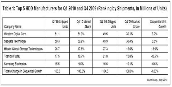 表1:2010年第一季度和2009年第四季度五大硬盤廠商(按出貨量排名,單位為百萬個)