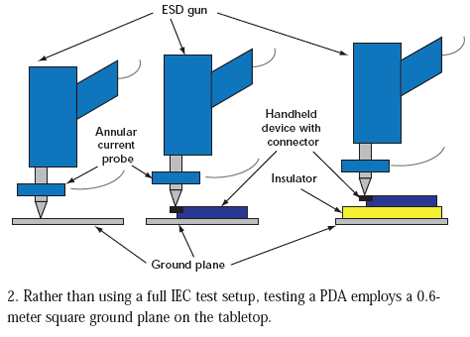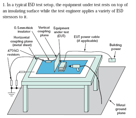 對于小型產品來說,工程師經常在專門的測試環境中執行系統級ESD測試(圖1)。對IEC61000-4-2測試而言,這些測試環境包括:地板上的金屬接地板、木桌、放在桌子上的金屬水平耦合板(到接地板有個0.95米長的連線,在水平耦合板之上的一個0.5mm絕緣層)。