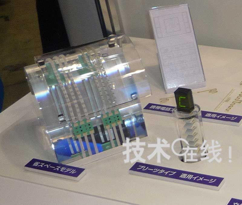 此外,還展示了將底板制成與設備縫隙一致的形狀,從而易于封裝并可有效利用縫隙的實例。展出了將封入了天線的底板切成圓形,以及與手機外殼形狀相同的底板。