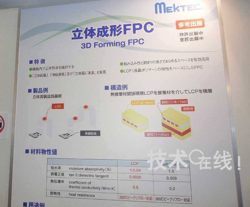 日本Mectron可立體成型的柔性底板“立體成型FPC”在“JPCA Show 2010”(2010年6月2~4日)上參考展出。該底板由熱可塑性液晶聚合物和銅箔構成,形成希望的構造并加熱后冷卻,可以保持其形狀。預定在2010年度內完成技術開發,2011年度開始量產。
