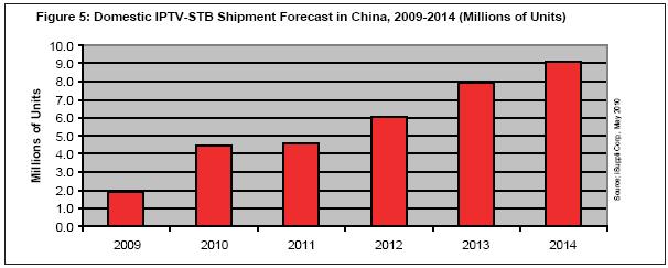 中國IPTV-STB市場快速增長,符合該國IPTV用戶的增長前景,估計用戶數量到2014年將達到3170萬個。2010年一年,預計IPTV用戶就將跳增到850萬,幾乎是2009年440萬的兩倍。