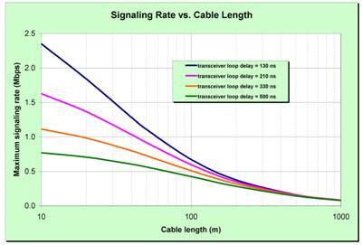 下面顯示了信號速率和線纜長度之間的權衡因素,以及收發器延遲帶來的影響。收發器帶來的延遲(包括相關隔離、電平轉換和保護)對于500kbps及以上的信號速率特別明顯。