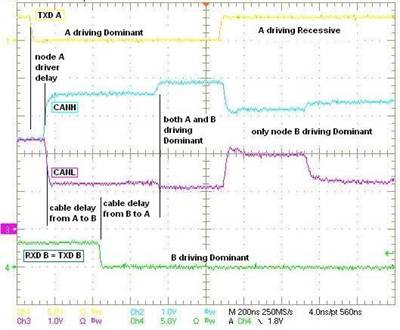 就1Mbps信號速率而言,在該比特結束以前,采樣點留有足夠的裕量,其表明使用快速收發器,40米以上的線纜長度是可行的。