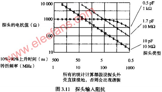 參見圖3.11,在我們關注的上升時間范圍內,探頭的并聯電容越高,阻抗會越低。在高頻時,只有并聯電容比較重要。