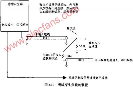 參見圖3.12,我們通過一個50歐阻抗的長傳輸線,將信號源連接到一個50歐的端接器在端接位置連接一個感應探頭,該探頭由一個1KΩ的電阻和一條5Ω阻抗的RG-174短同軸電纜組成。這個感應同軸電纜的另一端接到一臺高速采樣示波器的50Ω端接的輸入端上。