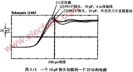 圖3.13展示了一個TEKTRONIXP6137探頭連接到測試點時的情形。P6137是一個10倍衰減,10PF的100MΩ類型探頭,應探頭連接到400MHZ的便攜式示波器。第一個波形是沒有加載探頭時的記錄結果;第二個波形是加載了帶有6IN長接地線探頭時記錄的結果;第三個波形是將裸探頭的尖端觸點直接接觸測試點A,探頭外殼用刀片直接接地時得到的結果。