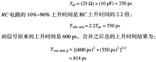 如第三個波形所示,當連接的串聯電感很小時,探頭等效于一個簡單的電容負載。圖3.12所示的測試點等效信號源端阻抗為25歐,當耦合到10PF的容性負載時,其RC上升時間是: