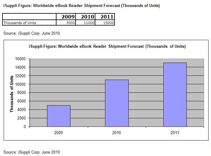 短期內,當電子書閱讀器的價格壓低到iPad起始價格點的一半左右時,可能會吸引消費者購買電子書閱讀器。不過,長期來看,電子書閱讀器仍可能有著比最初預期的更多利基。iSuppli預測,全球電子書閱讀器出貨量在2010年將達1,100萬部,2011年還可望成長120%,達到1,500萬部。