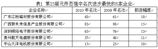 金融危機造成的企業(yè)經(jīng)營上的波動都反饋到了第22屆、23屆元件百強的榜單上。在近兩屆的榜單之中,均有20多家企業(yè)的名次出現(xiàn)了10位以上(含10位)的較大波動,去年23家,今年21家。據(jù)估計,如果國際國內(nèi)的經(jīng)濟(jì)形勢能保持穩(wěn)定,在未來一兩年內(nèi),元件百強榜單中,名次出現(xiàn)大起大落的企業(yè)數(shù)量將會減少。