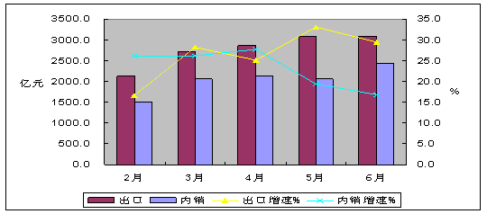 五、內外銷保持同步增長,出口繼續快于內銷。今年以來,隨著外需不斷回暖,外銷出現持續增長,到5月底,全行業累計外銷增速開始超過內銷,進入6月份,外銷增速優勢進一步加強,超過內銷增速4個百分點。其中,內銷產值11975.5億元,同比增長27.2%;出口交貨值16647.1億元,同比增長31.2%,高于產業平均增速1.7個百分點。產業出口依存度(58.1%)比去年同期提高0.7個百分點,比前5個月下降0.6個百分點。