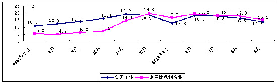 圖1 2009年7月至今規模以上電子信息制造業與全國工業增加值增速對比