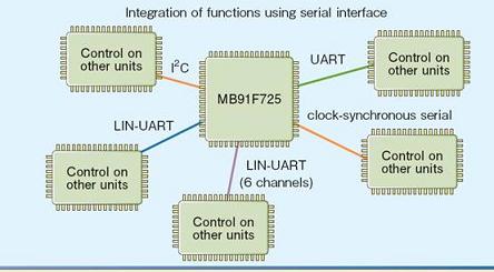 車用MCU連接的外圍相當多樣,而連接的接口可能是UART、頻率同步串行、LIN-UART和I2C,因此必須具備彈性的接口連接能力。為了滿足此需求,富士通將內置式多功能串行接口用作串行通信接口,并透過軟件方式來切換上述各種接口,以靈活支持外部組件的通信規范,并提高系統設計的自由度。新系列MCU還提供LIN-UART的6條通道,從而能夠與更多控制單元進行通信;其中MB91725系列因具有定時器功能的多條信道和A/D轉換器,更容易達成各種功能的整合。請參考(圖二)。
