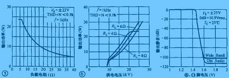 LM1876的負載范圍很寬,在4~30Ω的范圍內均能穩定地工作,其輸出功率與負載的對應關系如圖5所示。LM1876的供電電壓范圍為±10~±25V,當供電電壓降低時,影響的只是輸出功率的大小,而對其他指標影響不大,供電電壓與輸出功率的對應關系如圖6所示。LM1876的6、11腳為左/右聲道靜噪控制端,當這幾腳接高電平(高于1.6V)時,LM1876內部電路執行靜音操作,切斷輸出端的音頻信號(如圖7所示)。因此可以在這些引腳中與正電壓之間接一個RC延時網絡,使其在開機瞬間為高電平,輸出電路無音頻信號輸出,延時一段時間后,再正常輸出,以達到避免開機瞬間輸出端電位失諧對揚聲器的沖擊。在圖4中,晶體管VT1、R24、C16、R20、C15即為開機延時網絡,調整它們的取值范圍,可以改變延時時間的長短,從而獲得滿意的開機延時時間。