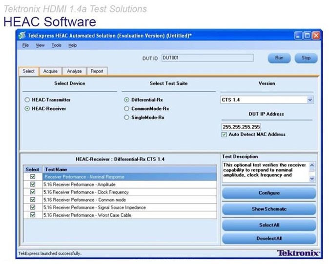 HEAC軟件包含了以太網發送/接收測試軟件,以太網接收測試軟件可控制信號發生器和示波器,設置信號(靈敏度、時鐘頻率、共模抑制、誤碼率),并且提取和檢查相應信號(軟件HYBRID和數據包分析);還包含了音頻發送和接收測試軟件,音頻接收軟件即為任意波形發生軟件(格式支持、模抑制、抖動容限),這樣就不需要分別部署以太網和音頻信號發生器進行組合使用,使測試變得更加簡單,也降低了測試成本。