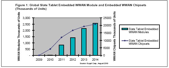 圖1所示為iSuppli公司對于2009-2014年slate平板電腦市場嵌入WWAN模塊與嵌入WWAN芯片組出貨量的預測。