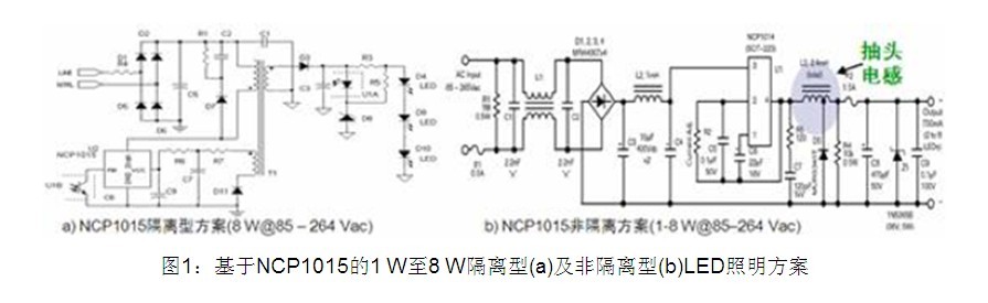 1W至8W的低功率LED通用照明應用包括G13、GU10、PAR16、PAR20和嵌燈等。這類應用的輸入電壓范圍在交流90至264 V之間,恒流輸出電流包括350 mA和700 mA兩種,能效要求為80%,還要求提供短路和過壓保護等特性。這類應用可以采用安森美半導體的NCP1015自供電單片開關控制IC。該器件集成了固定頻率(65/100/130 kHz)電流模式控制器和700 V的高壓MOSFET,具備構建強固的低成本電源所需的全部特性,如軟啟動、頻率抖動、短路保護、跳周期、最大峰值電流設定及動態自供電功能(無需輔助繞組)等。NCP1015既可用于隔離型方案,也可用于非隔離型方案,見圖1。