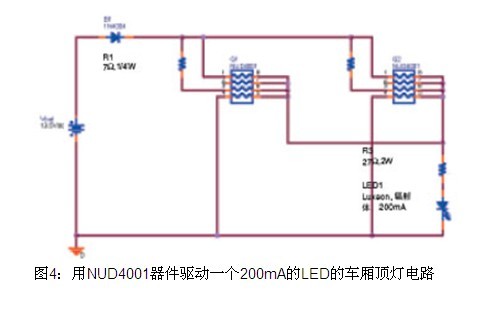 NUD4001提供了一種滿足汽車應用的低成本解決方案。與采用線性或開關穩壓器相比,它的設計更簡便,可以構成更簡單而且成本更低的電路,見圖4。