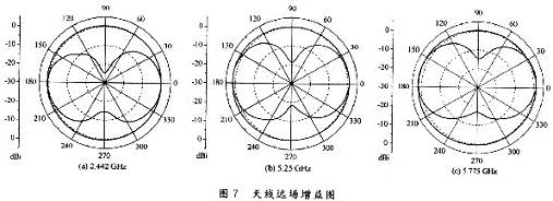 圖6示出了非均勻彎折線單極子天線的回波損耗曲線。從圖中可以看出,仿真結(jié)果與實(shí)際測試結(jié)果比較吻合。低頻段測得的阻抗帶寬(S1-1<-10dB)約為O.5GHz(2.2~2.7GHz);高頻段實(shí)際測得的阻抗帶寬(S11<-10dB)約為1.8GHz(4.48~6.28GHz)。圖7(a)~(c)分別示出了非均勻彎折線單極子天線在2.442GHz,5.25GHz和5.775GHz時的增益圖,增益分別為0.7dBi,1.65dBi和2.3dBi。