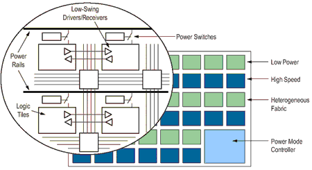 圖3所示為具有上述某些概念的FPGA架構,其可編程異構架構由高速度和低功耗兩個區組成。一個片上功耗模式控制器可管理各種降功耗模式,即深睡眠模式、懸掛模式和休眠模式。在架構內部,可以用專用的供電開關關掉每個邏輯塊的電源。通過布線架構的通信信號流經低擺幅驅動器和接收器,以降低互連功耗。