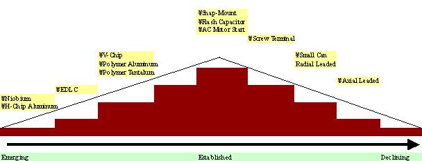 鋁電容器技術(shù)路線圖已經(jīng)發(fā)展到一個(gè)節(jié)點(diǎn)上,在此新投資聚集在鋁固體聚合物元件,以及作為替代技術(shù)的碳和鈮介質(zhì)開發(fā)上。更完善的產(chǎn)品,如單元安裝電容器(snap-mount)、閃光電容器(flash capacitor),和馬達(dá)啟動(dòng)鋁電容器(motor start aluminum capacitors)已收到有限的投資,但繼續(xù)服務(wù)于更小的、增值的電容細(xì)分市場(chǎng)。老產(chǎn)品用于新技術(shù)研發(fā)所獲得的資金支持會(huì)更少,包括標(biāo)準(zhǔn)的徑向引線鋁電容器和軸向鋁電容器。例如,軸向引線鋁電容器,近些年來已經(jīng)很少受到關(guān)注,但是他們現(xiàn)在作為一個(gè)傳統(tǒng)產(chǎn)品,在國(guó)防和汽車應(yīng)用方面仍然保有市場(chǎng)。當(dāng)用于上述圖表中列舉的所有主要產(chǎn)品的投資,在過去20年中獲得了不同程度的回報(bào)之時(shí),市場(chǎng)已經(jīng)轉(zhuǎn)向鋁固體聚合物電容設(shè)計(jì),行業(yè)中的主要供應(yīng)商正在調(diào)整自己的定位以把握巨大的市場(chǎng)機(jī)會(huì)。而且,在一些不同用途的關(guān)鍵細(xì)分市場(chǎng)上,如醫(yī)療電子,石油和天然氣勘探等領(lǐng)域,引入導(dǎo)電聚合物鋁技術(shù),也會(huì)帶來增值和在特定應(yīng)用市場(chǎng)的機(jī)會(huì)。