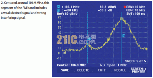 在不同的發生器1頻率設置點觀察到以下現象:如果測試裝置有限制因素,那么音頻的信噪比(SNR)不會隨著干擾射頻信號的遠離而變化。如表所示,接收機的去靈敏作用是由強大的干擾源引起的,從而證明來自測試裝置的噪聲不是106.7MHz測試頻率點的限制因素。