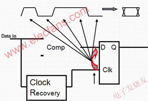 圖1:串行數(shù)據(jù)中的抖動,每個時鐘的數(shù)據(jù)級、上升沿和下降沿都在D處表示出來。數(shù)據(jù)鎖存是數(shù)據(jù)通信的關(guān)鍵環(huán)節(jié),在示波器上以眼圖形式顯示。