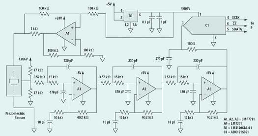 ADC121S021是一款設(shè)有串行外圍接口(SPI)的12位、200kSPS單端輸入轉(zhuǎn)換器。型號為LM4140ACM-4.1的另一款高精度電壓參考電路可為這款模擬/數(shù)字轉(zhuǎn)換器提供電壓參考,并為濾波放大器提供偏壓,并設(shè)置濾波器的偏置電壓為模擬/數(shù)字轉(zhuǎn)換器輸入電壓范圍的一半。傳感器的輸出屬于交流電信號,而中度的電平偏移可將信號轉(zhuǎn)移到模擬/數(shù)字轉(zhuǎn)換器輸入電壓范圍內(nèi)的中央位置。LM4140芯片也可為LM730132V通用放大器(即A4放大器)所輸出的壓控電流提供電壓參考。傳感器內(nèi)置的MOSFET可為壓電傳感電路提供緩沖。A4放大器負責(zé)輸出電流,以便驅(qū)動組成為共源級放大器的MOSFET,而有關(guān)晶體管則通過交流耦合與輸出終端裝置連接在一起。