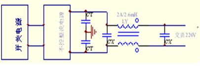 第二種方法的抗干擾設(shè)計(jì)考慮如圖8所示,圖中在交流輸入通道上設(shè)計(jì)線路濾波器對系統(tǒng)抗干擾具有很好的作用。其中CX為差模濾波電容(又稱X電容)跨接在輸入端之間,對差模電流起旁路作用,容值一般為0.1—1uF.LY為共模電感,用來抑制共模干擾電流。CY為共模電容(又稱Y電容),跨接在線路與機(jī)殼之間,對共模電流起旁路作用,但電容值不能過大,否則會超過安全標(biāo)準(zhǔn)中對漏電流的限制要求,一般在10000PF以下。