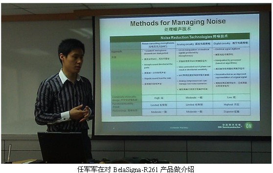 生活在都市的人們通常會在嘈雜的環境中撥打或接聽電話,人們總是希望能夠像在田野中一般獲得清晰并且沒有失真的聲音。對于手機廠商來講,采用能夠清晰拾取語音并抑制噪聲的解決方案是關鍵。為了應對上述挑戰,安森美半導體推出了高性能語音捕獲SoC方案BelaSigna-R261。安森美半導體音頻與助聽器中國市場開發經理任軍軍在日前的產品發布會上對BelaSigna-R261的特性做了介紹,并現場對產品進行了演示。