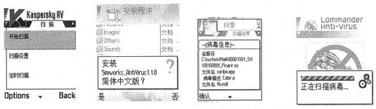 (3)針對目前智能手機感染的典型病毒:CommWarrior、Cabir手機病毒和Mabir.A手機病毒,各軟件公司已經陸續推出了一些防病毒軟件,如NetQin手機殺毒系統、金山手機毒霸、卡巴斯基手機殺毒軟件、光華反病毒手機殺毒軟件SymbianS60、TSG_Phone_Safe_殺手機病毒軟件、Anti-Virus.v1.10、Simworks_AnitiVirus_1.16等。各運營商可以推薦用戶進行相關軟件的加載,手機廠家也可以根據自身情況出廠時預裝一些殺毒軟件(見圖5)。