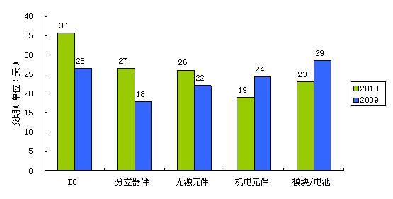 本次調(diào)查的結(jié)果印證了2010年電子行業(yè)所面臨的“缺貨”困境——2010年電子系統(tǒng)制造商與設(shè)計公司面臨的最普遍的采購風(fēng)險是無法供貨,43.6%的公司面臨著供應(yīng)商無法供貨的困擾。與2009年的調(diào)查做對比,2010年IC、分立器件、無源元件、機電元件、模塊/電池五大類物料價格有不同幅度增長,其中IC與分立器件漲幅最大,機電元件、模塊/電池漲幅最小;交貨期方面,IC、分立器件、無源元件交貨期都有所延長,而機電元件、模塊/電池交貨期分別縮短了5天和6天;貨款結(jié)算期方面,IC、分立器件貨款結(jié)算期均有所延長,無源元件、機電元件、模塊/電池的貨款結(jié)算期都縮短了。