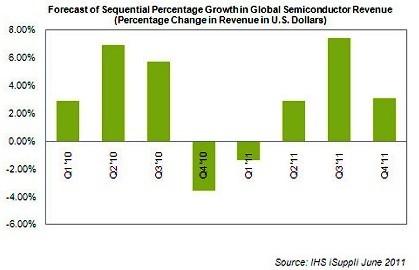根據IHS的統計,日本共有14家半導體供應商與4家硅晶圓制造商受到地震沖擊。該機構預期,全球半導體營收將在第三季獲得加強力道,當季成長率可達7.4%,與日本廠商恢復全面生產相互呼應。全球半導體營收成 長率在第一季呈現1.4%的衰退,第二季則是成長2.9,預期第四季可成長3.1%。