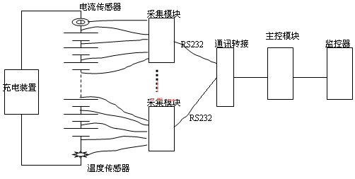 在電力系統(tǒng)變電站目前使用較多的蓄電池在線監(jiān)測(cè)裝置是電池巡檢儀,電池巡檢儀又分為兩種,一種是測(cè)量蓄電池單體電壓的巡檢儀,結(jié)構(gòu)是由一個(gè)主控模塊和數(shù)個(gè)采集模塊組成,主模塊接收監(jiān)控器的命令,發(fā)送電池?cái)?shù)據(jù)到直流設(shè)備的監(jiān)控器;采集模塊中每個(gè)模塊采集10~20節(jié)電池的電壓、電流和溫度;通過(guò)直流充電設(shè)備的監(jiān)控器可顯示各單節(jié)電池電壓,判斷故障電池的編號(hào)且給出報(bào)警。這類電池巡監(jiān)儀一般由直流設(shè)備生產(chǎn)廠家提供,在訂貨直流設(shè)備時(shí)它是選配裝置,由于功能單一、不能測(cè)試容量、且測(cè)量精度差、容易誤報(bào),限制了它的廣泛使用。測(cè)試示意圖如圖1: