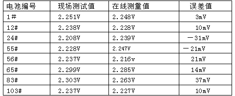 根據(jù)規(guī)程的要求,日常測(cè)量蓄電池端電壓采用是高精度4位半的數(shù)字萬(wàn)用表,一般高精度萬(wàn)用表蓄電池直流電壓檔測(cè)量精度為0.7%以上,絕大多數(shù)蓄電池在線裝置產(chǎn)品說(shuō)明書(shū)上提到的測(cè)量精度達(dá)到了0.5%以上;顯示測(cè)量數(shù)值有些蓄電池在線裝置的測(cè)量端電壓數(shù)值為小數(shù)點(diǎn)后2位,與規(guī)程要求有較大誤差;有些裝置測(cè)量值雖可以到小數(shù)點(diǎn)后3位,但與實(shí)際用表測(cè)量數(shù)值相差較大。從運(yùn)行情況看,端電壓在線監(jiān)測(cè)的誤差是隨機(jī),每個(gè)數(shù)值偏差都不一致,而且偏差值隨著環(huán)境溫度、浮充電壓變化等而變化。表1為現(xiàn)場(chǎng)任意抽查幾個(gè)蓄電池浮充電壓,現(xiàn)場(chǎng)測(cè)試值與在線測(cè)量值的誤差情況,現(xiàn)場(chǎng)測(cè)試采用FLUK111數(shù)值萬(wàn)用表直流檔測(cè)量精度0.7%,在線測(cè)量為許繼電源公司的WXJ-16型巡檢儀,測(cè)試環(huán)境溫度25℃。