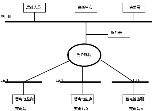 蓄電池在線監(jiān)測(cè)還可以利用通訊手段進(jìn)行網(wǎng)絡(luò)化管理(如圖4),將幾個(gè)站或一地區(qū)的蓄電池監(jiān)測(cè)通過(guò)光纖進(jìn)行組網(wǎng),建立一個(gè)實(shí)時(shí)遠(yuǎn)程智能化蓄電池監(jiān)測(cè)網(wǎng)絡(luò)化管理系統(tǒng),以實(shí)現(xiàn)信息集中和遠(yuǎn)程控制,使運(yùn)行檢修人員、相關(guān)人員和管理決策層能夠通過(guò)局域網(wǎng)內(nèi)的任何一個(gè)終端用IE瀏覽的方式即可實(shí)時(shí)掌握各變電站蓄電池的運(yùn)行情況及其性能變化趨勢(shì),使蓄電池得到及時(shí)的維護(hù),同時(shí)也為“設(shè)備狀態(tài)檢修”提供可靠依據(jù),將“定期維護(hù)檢修”轉(zhuǎn)變?yōu)?ldquo;狀態(tài)檢修”,從而實(shí)現(xiàn)對(duì)蓄電池的科學(xué)化管理,保證系統(tǒng)的可靠、安全運(yùn)行。