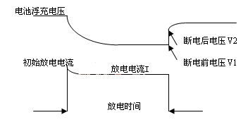 蓄電池在線內(nèi)阻監(jiān)測(cè),通過(guò)電池向放電模塊瞬時(shí)放電,測(cè)量電池?cái)嚯娝查g的電壓差,計(jì)算電池內(nèi)阻(R內(nèi)阻=△V/I),內(nèi)阻測(cè)試原理如圖3。由于在線監(jiān)測(cè)中出現(xiàn)的端電壓監(jiān)測(cè)誤差、放電過(guò)程電流波動(dòng)、斷電前后電壓補(bǔ)捉測(cè)量技術(shù),以及在線連接線電量衰檢等問(wèn)題,內(nèi)阻在線監(jiān)測(cè)精度不高。目前,在國(guó)內(nèi)美國(guó)ABLER便攜式內(nèi)阻測(cè)試儀應(yīng)用較多,它的在線式內(nèi)阻測(cè)試系統(tǒng)測(cè)試精度與便攜式相比稍差,但與目前使用的其他產(chǎn)品相比還是要好些。