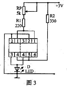 光電耦合器檢測電路如圖3所示,可將TLP621等四個引腳的光電耦合器插入插座左端的四個引腳的插孔中,將TLP332等六個引腳的光電耦合器插入插座右端的六個引腳的插孔中。接通電源后,電源經(jīng)RP、R1給IC中的發(fā)光二極管提供一個正向電壓,發(fā)光二極管發(fā)光,使IC中的光電三極管導(dǎo)通,3腳外接的發(fā)光二極管D發(fā)光,若調(diào)節(jié)RP時,發(fā)光二極管的亮度能跟著變化,則被測光電耦合器是好的。