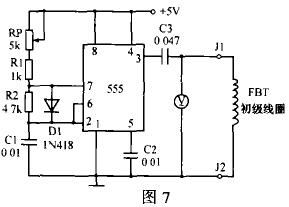 行輸出變壓器檢測電路如圖7所示,555集成定時器與外接元件構(gòu)成多諧振蕩器。調(diào)節(jié)RP可產(chǎn)生12.5~25kHz的方波脈沖,由3腳經(jīng)C3耦合輸出作為FBT初級線圈電諧振的激勵脈沖,C3與FBT初級線圈組成一串聯(lián)諧振電路。