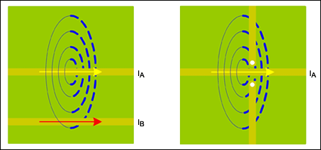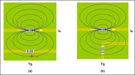 式中,YB是向電路B注入的誤差電壓,IA是在電路A作用的電流1。LM對電路間距、電感環路面積(即磁通量)以及環路方向非常敏感。因此,緊湊的電路布局和降低耦合之間的最佳平衡是正確排列所有電感的方向。
